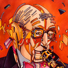 Dans mes illustrations sur le thème de la musique, je cherche à transposer, par le trait et la couleur, la fusion du son produit par l’instrument avec le musicien. Je trouve mon inspiration dans l’écoute des œuvres musicales « Jazz » et « Classiques ». L’arrêt sur image concentré dans l’espace du cadre traduit un extrait du processus de cette métamorphose.